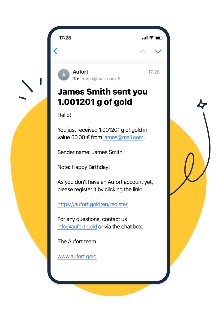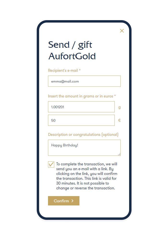 Die Zukunft ist da! Mit dem Goldkonto von Aufort können Sie sofort Gold senden oder verschenken, wo und wann immer Sie möchten. Es ist so einfach wie das Versenden einer E-Mail.