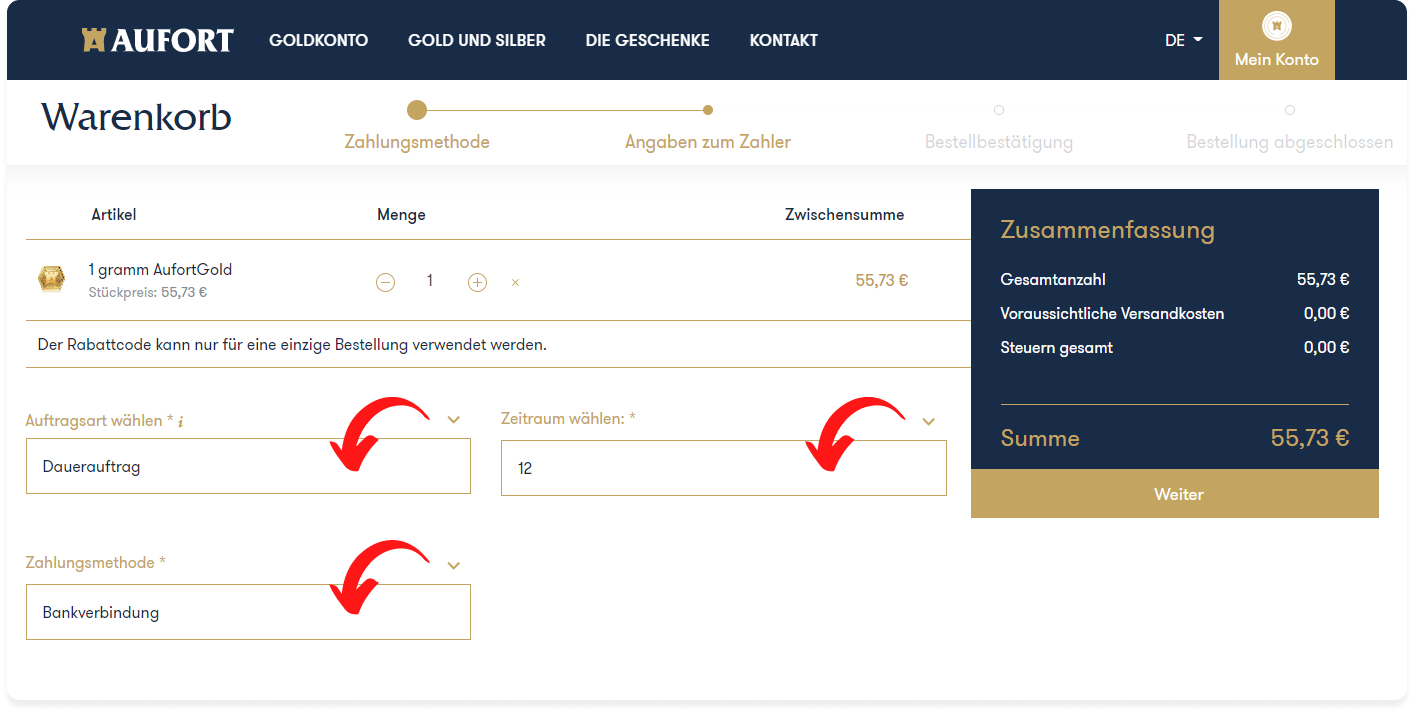 2. Wählen Sie im Warenkorb „Dauerauftrag“ und geben Sie den entsprechenden Zeitraum (2 bis 36 Monate) an.