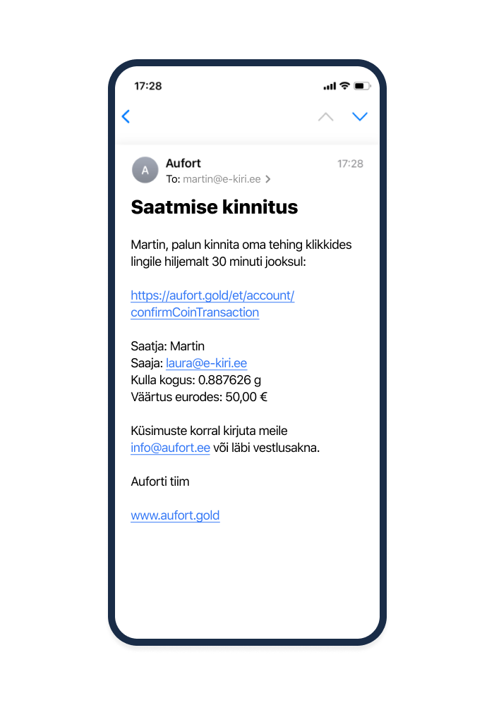 | Saaja saab kulla koheselt kätte. Kui tal pole Auforti kullakontot, saab ta juhised selle registreerimiseks. | ![]() ![]() |